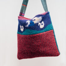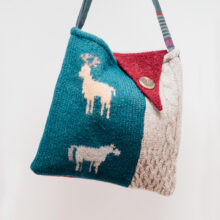 Wool purse with an a fabric lined interior, inner pocket, button closure and a fabric cross-body strap.