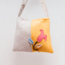 Wool purse with an a fabric lined interior, inner pocket, button closure and a fabric cross-body strap.